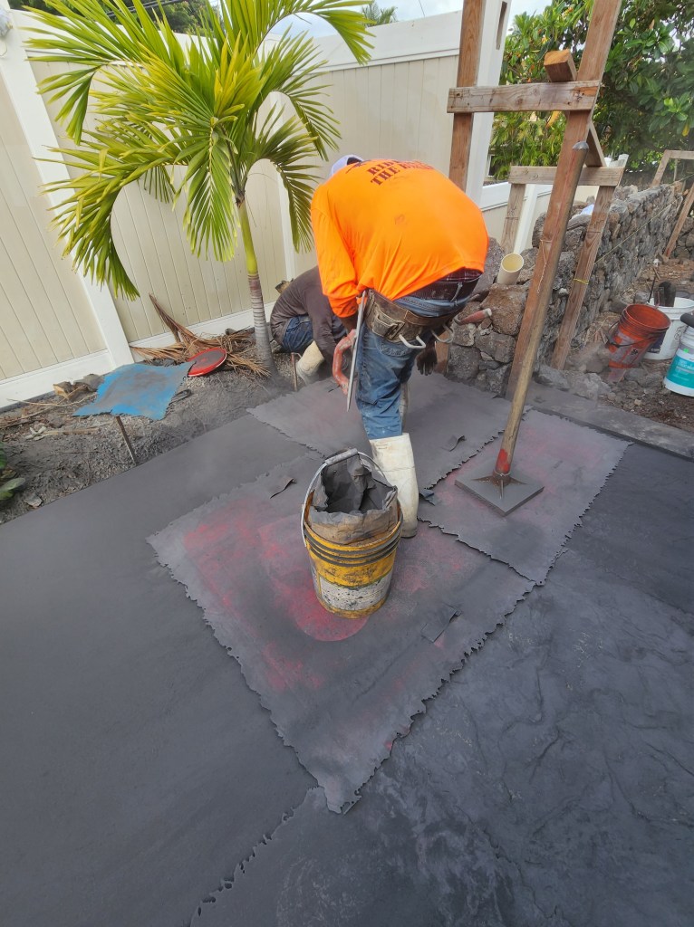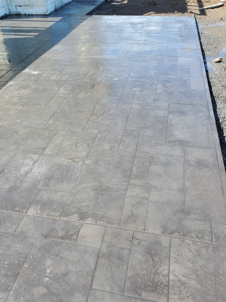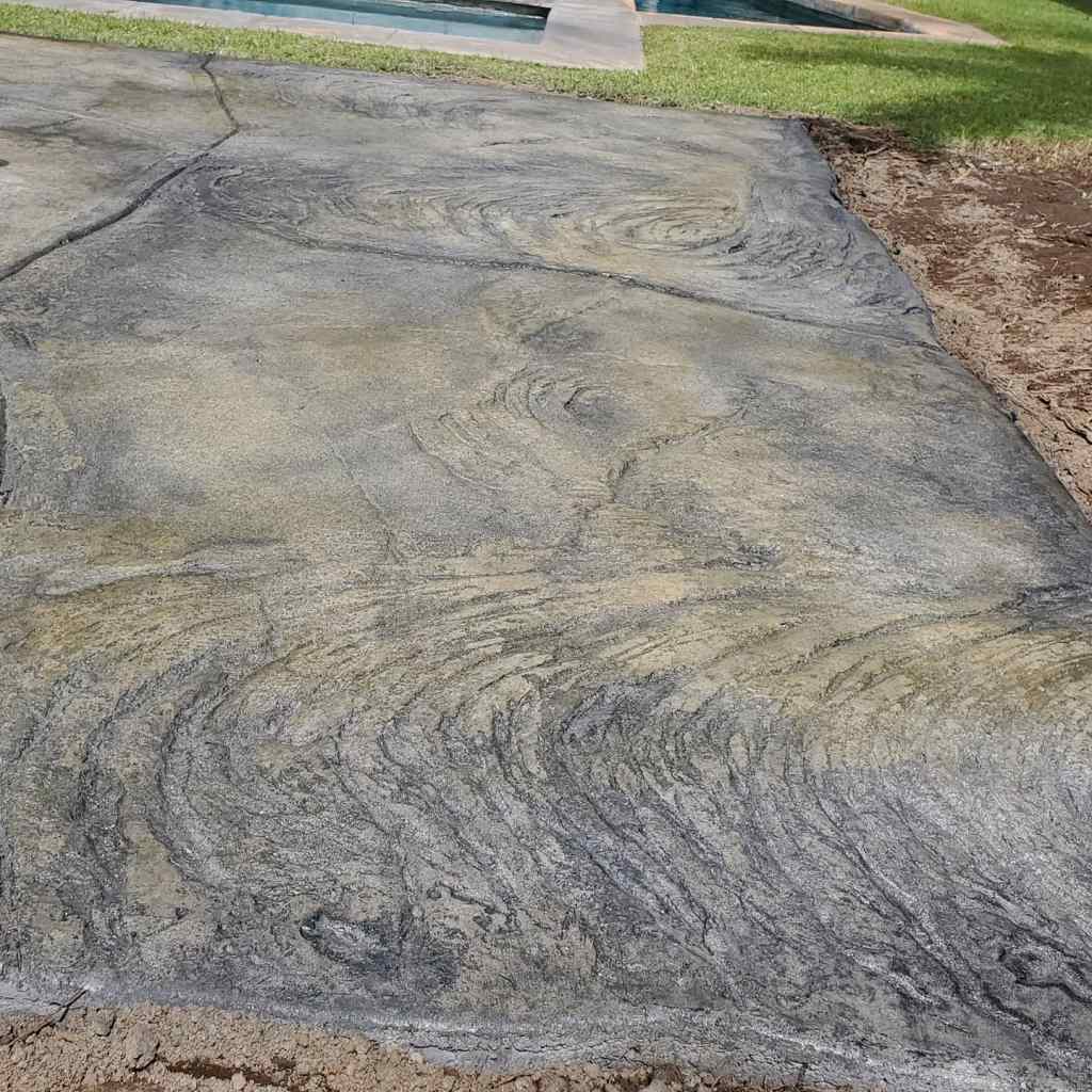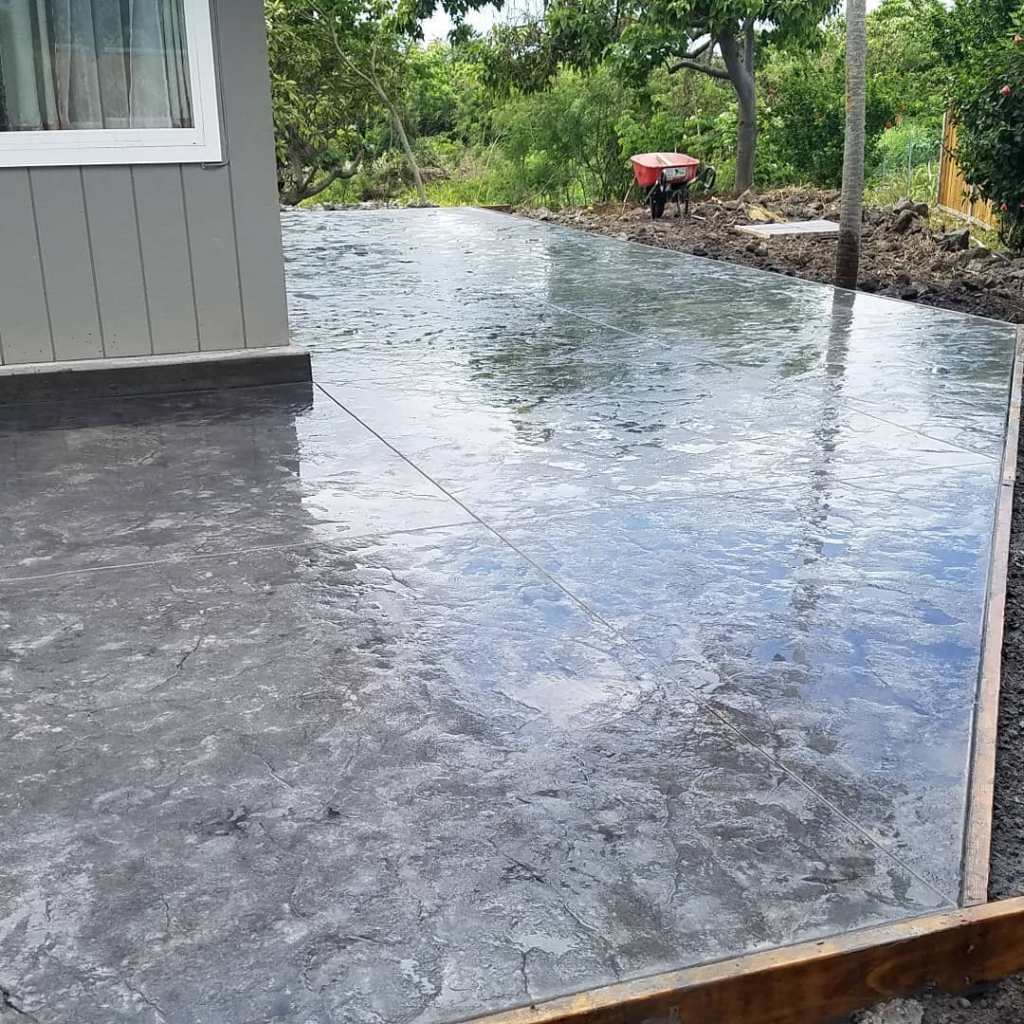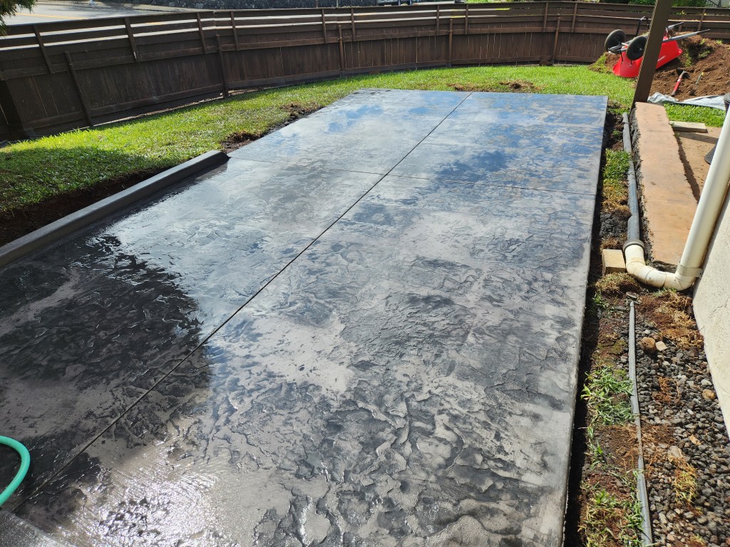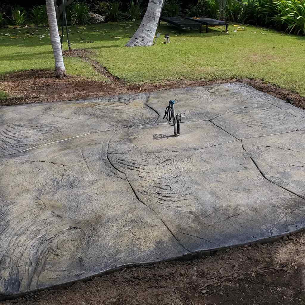 **Stamped Concrete: This technique imprints patterns into fresh concrete to replicate materials like Roman Slate, and Pahoehoe Lava. In Hawaii, popular patterns include slate for a timeless look, Ashlar for cobblestone charm, and Lava stamps for a warm, island vibe. It withstands heavy foot traffic and weather, making it ideal for patios and driveways.